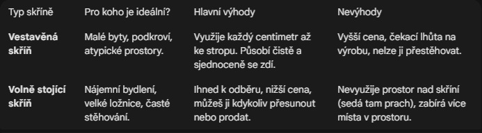 💡 Tip: Pokud bydlíš v nájmu, volně stojící skříň je jasná volba. Pokud ale vlastníš malý byt a potřebuješ uložit sezónní věci, lyže i kufr, vestavěná skříň se ti z dlouhodobého hlediska vyplatí více.